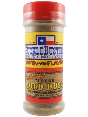 SuckleBusters Texas Gold Dust All Purpose Seasoning (4oz./113g) Ingredients: Sea salt, chile pepper, black pepper, cumin, garlic, turbinado sugar, thyme.  | | |