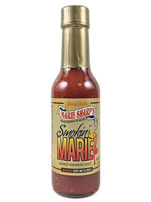 Marie Sharp's Smokin' Marie Pepper Sauce (5 fl. oz. / 148 ml) Ingredients: Smoked Habanero Pepper, Vinegar, Carrots, Salt, Onion, Lime Juice, Garlic and spices.  | | |