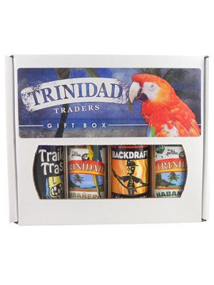 Trinidad Traders Gift Box (Four 5oz. bottles): Trailer Trash Cayenne Pepper Hot Sauce (5 FL.OZ. / 148 ml): Ingredients: Cayenne Peppers, Distilled Vinegar, Salt, Black Pepper, Natural Gum, Butter Flavor, and Citric Acid. Backdraft Hot Sauce (5 FL.OZ. / 148 ml): Ingredients: Sugar, Yellow Mustard, Water, Light Brown Sugar, Tomato Paste, Herbs, Spices, Salt, Natural Flavoring, Pepper, Habanero Pepper, and Natural Gum. Trinidad Extra Hot Habanero Pepper Sauce (5 FL.OZ. / 148 ml):Ingredients: Habanero Peppers, Onions, Vinegar, Green Peppers, Celery, Mustard, Ginger, Garlic, Salt, Thyme, Basil, and other fine Herbs. Trinidad Mild Habanero Pepper Sauce (5 FL.OZ. / 148 ml): Ingredients: Onions, Habanero Peppers, Vinegar, Green Peppers, Celery, Mustard, Ginger, Garlic, Salt, Thyme, Basil, and other fine Herbs.