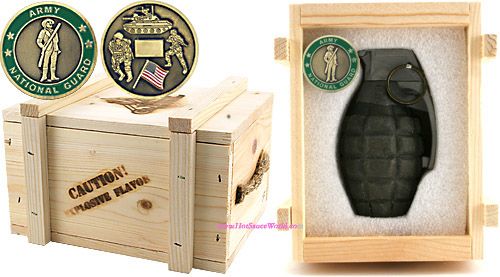 Caboom! MK-2 Army National Guard Fragmentation Grenade - Caution! Explosive Flavor. The Grenade Contains 6 oz. of Grade A Hot Sauce! Great gift for our Hero's in the Military. Ingredients: Habaneros, Vinegar, Tomato Paste, Lemon Juice, Onion, Garlic, Salt.