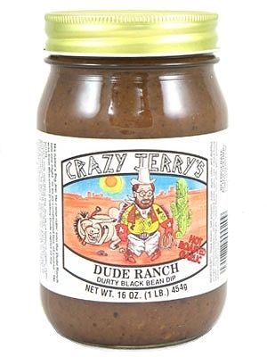 Crazy Jerry's Dude Ranch Durty Black Bean Dip (16 FL.OZ. / 454 g): His name's Big Jim. He came ridin' into the Dude Ranch late one night "in an air-conditioned bus, of course". He was from Wisconsin (Cowboy Dude capitol of the world). There's only one this Big Jim liked better'n ropin', ridin', and showin' off his purty new duds - that's eatin'. And there's nothing' he liked to eat moren' a big ol' bucket of Dude Ranch Bean Dip, of course, his horse couldn't carry him after he ate, but Big Jim doesn't care because eatin' is his life. Have a great day. Ingredients: Black Beans, Bell Peppers, Water, Apple Cider and Distilled Vinegar, Jalapeno Peppers, Onions, Roasted Garlic, Garlic, Salt, Natural Flavor, Garlic Powder, Onion Powder, and Spices. Brand: Crazy Jerry's Sauces