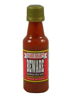Marie Sharp's Beware Mini (1.69oz./50ml) Ingredients: Habanero Pepper Mash, Capsium Oil, Fresh Carrots, White Vinegar, Lime Juice, Tomato, N'awlins Cajun and Creole Spices, Onions, Garlic, and Salt