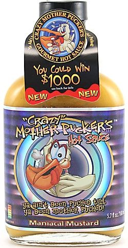 Crazy Mother Pucker's Maniacal Mustard Hot Sauce - Ya Ain't Been Pucked Till Ya Been Mother Pucked!- Prepared Yellow Mustard(Water, Mustard Seed, Distilled Vinegar, Salt, Turmeric), Red Wine Vinegar, Habanero Peppers, Onions, Natural Sugar, Turmeric, Cayenne Peppers, Xanthan Gum, Black Pepper, Mustard, Powder, Salt, And Celery Seed 5.7oz.