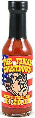 The Final Countdown Hot Sauce - (George W Bush) 01-20-09 Poor Georgie boy. His days are numbered and the nation is counting them down. Help celebrate the countdown when America will regain it's ability to actually think again in the year 2009. 5oz