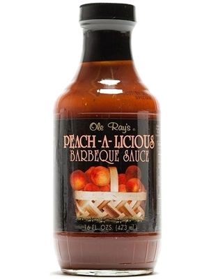 Ole Ray's Peach-A-Licious Barbecue Sauce (16 FL.OZ. / 473ml): A great cooking, glazing, or marinade sauce that will add a wonderful southern fruit flavor to all you BBQ recipes. Ingredients: Tomatoes, Peach Jelly, Lemon Juice, Apple Cider Vinegar, Corn Syrup, Molasses, Yellow Mustard, Brown Sugar, Liquid Smoke, Cayenne Pepper, Caramel, Black Pepper, Cinnamon, Garlic Powder, Onion Powder, and Spices.